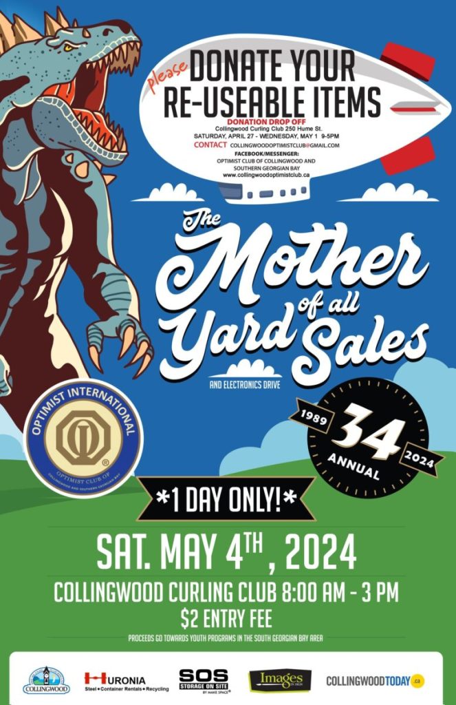 The Mother Of All Yard Sales is an annual event held at the beginning of May each year on Saturday. This fabulous giant garage sale takes place at the Collingwood Curling Club. All items are donated by our community and resold at terrific prices. Watch for posters for exact times. Money raised from this event goes to support local youth programs.
